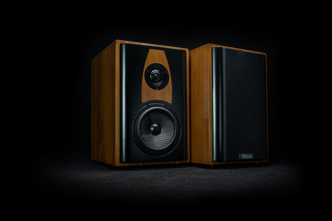 The furniture grade finish is a natural walnut and black lacquer combination offering a timeless design enhancing any living area, desktop or monitor console. The cabinet bottom is equipped with screw in gold plated feet complete with scratch protection discs and the cloth grill is suspended by invisible magnets.